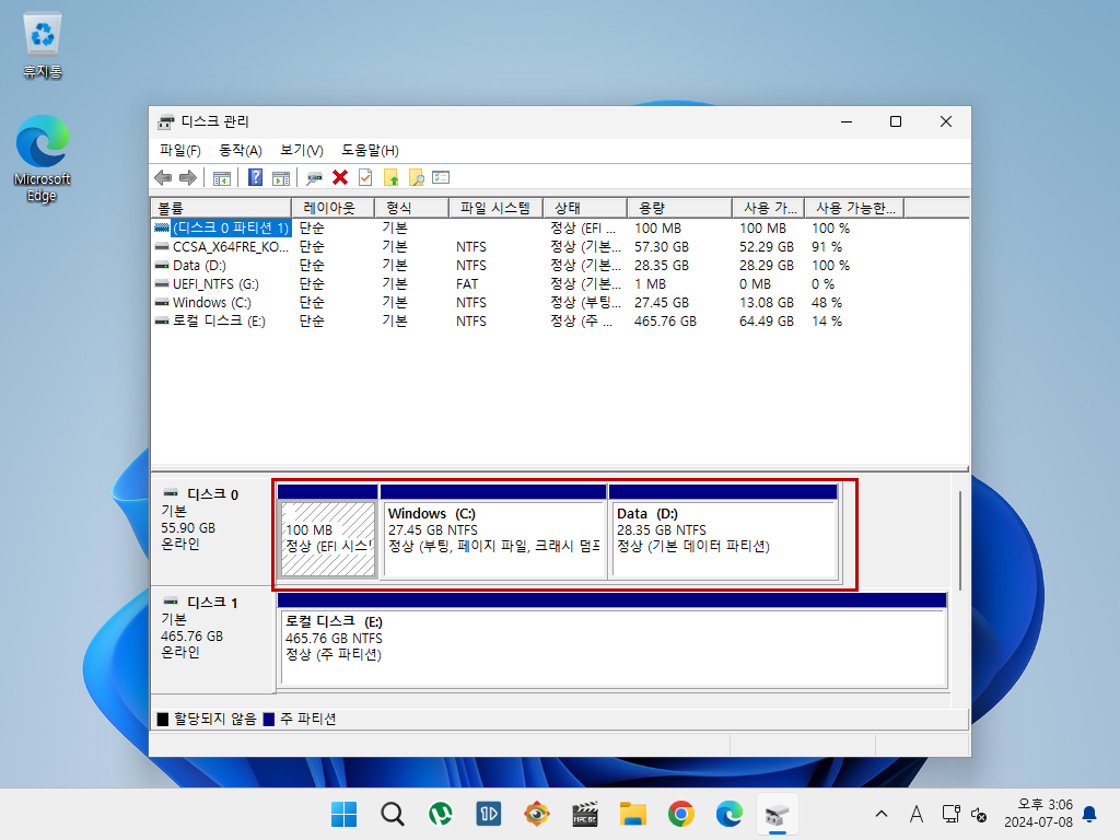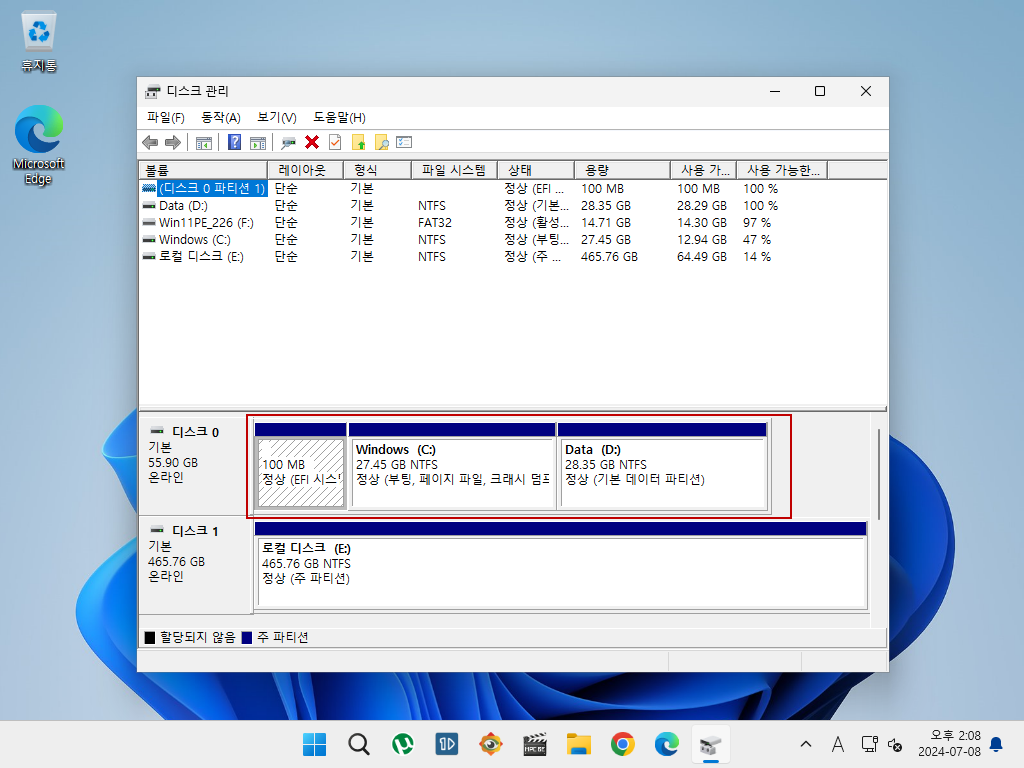아래처럼 디스크관리자에서 파티션이 구성되어 있구요.