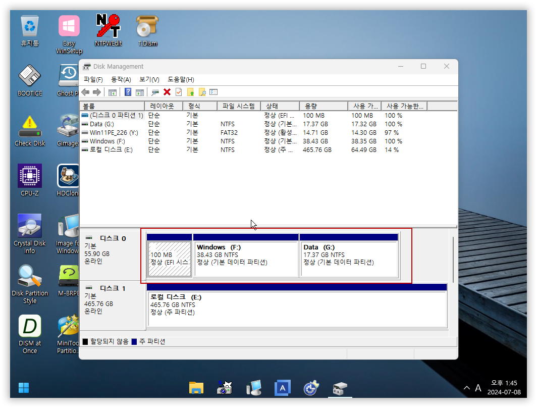 PE로 부팅해서 C 드라이브를 2개의 파티션으로 나눠봤습니다...