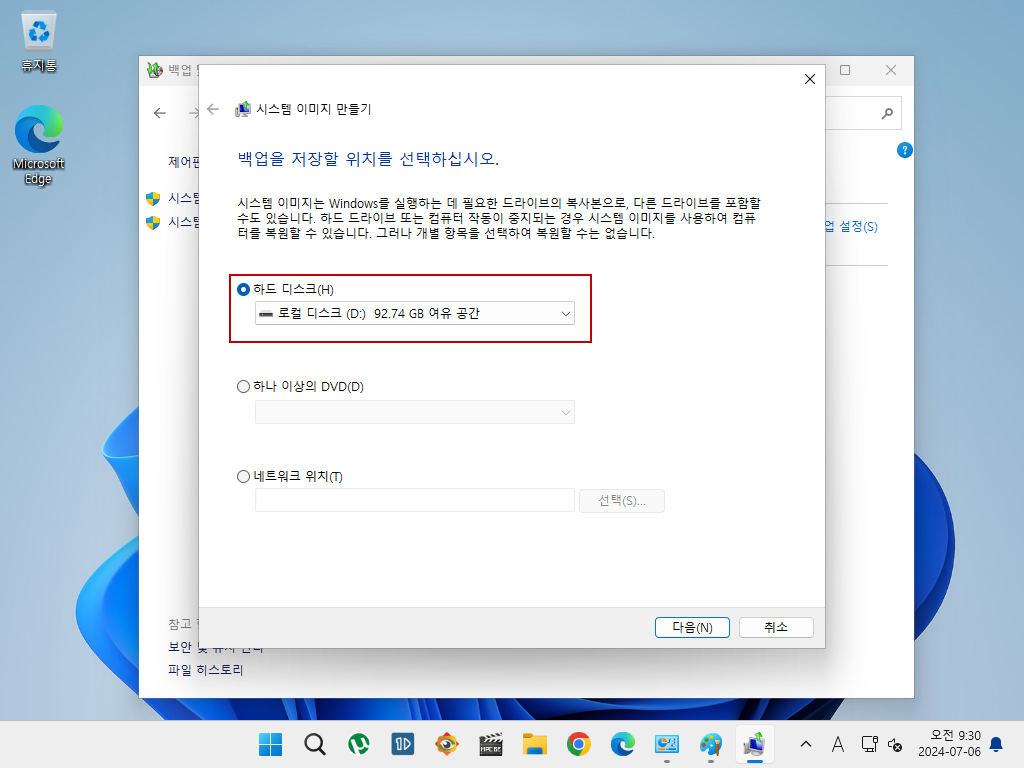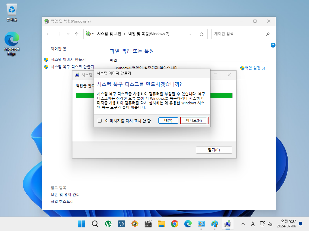 시스템 복구 디스크를 만들 수 있는 창입니다...