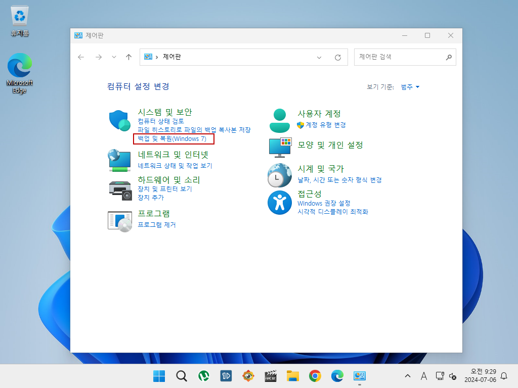 제어판을 열어서 [시스템 및 보안] 항목의 "백업 및 복원(Windows 7)" 메뉴를 선택해줍니다.