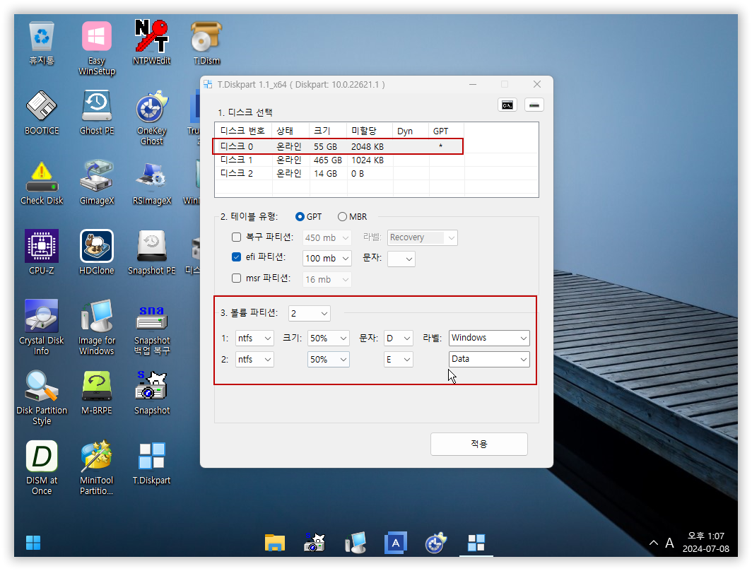 이번에는 PE로 부팅해서 디스크를 70 : 30%로 나눠봤습니다...