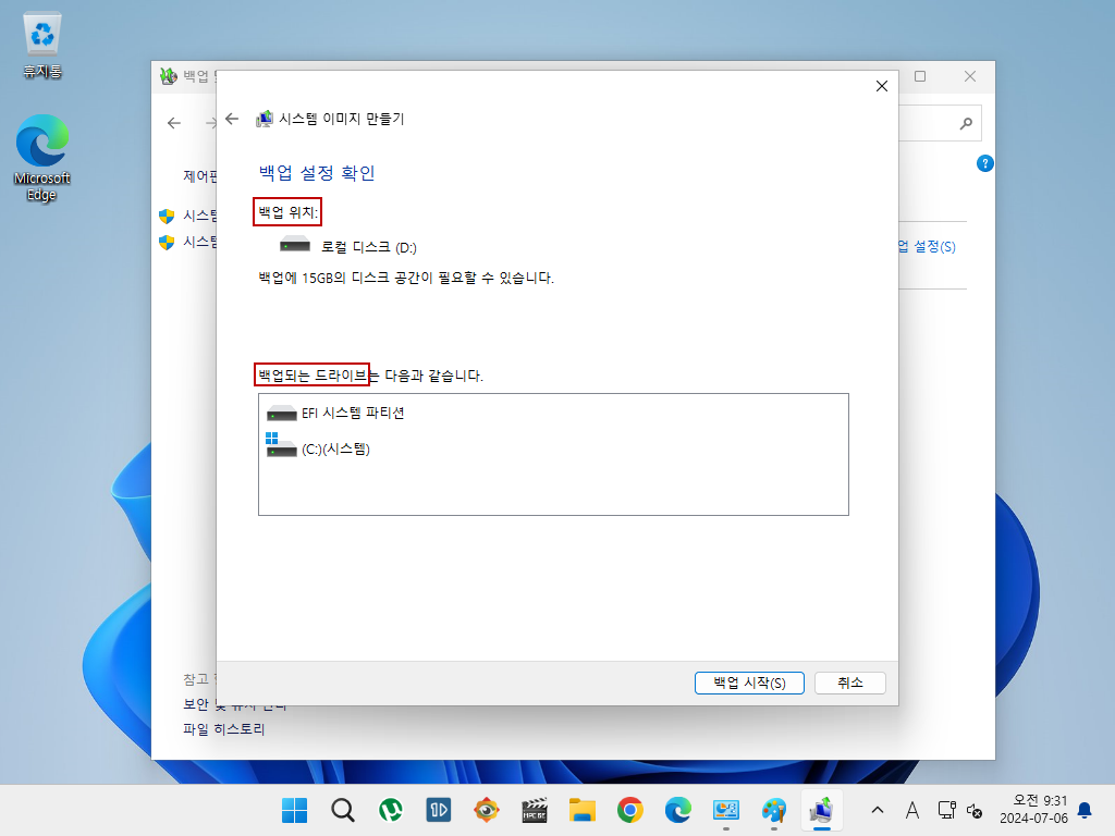 백업 위치와 백업되는 드라이브를 확인하고... [백업 시작] 버튼을 눌러줍니다.