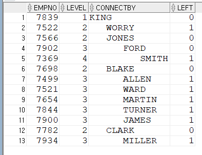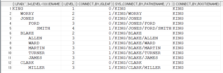레벨 단위로 정렬이 잘 되었습니다.이제 SIBLINGS를 사용해서 깔끔한 계층형 쿼리를 만들 수 있습니다.