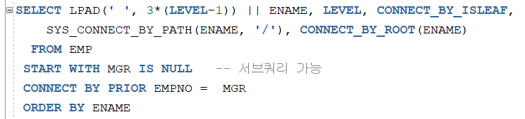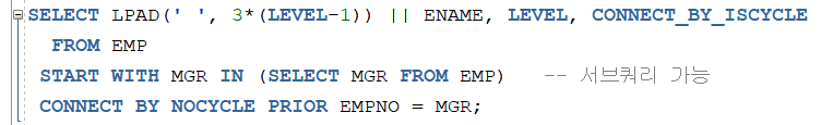 START WITH에서 관리자 컬럼이 NULL인 부분을 조건식으로 넣게 됩니다.